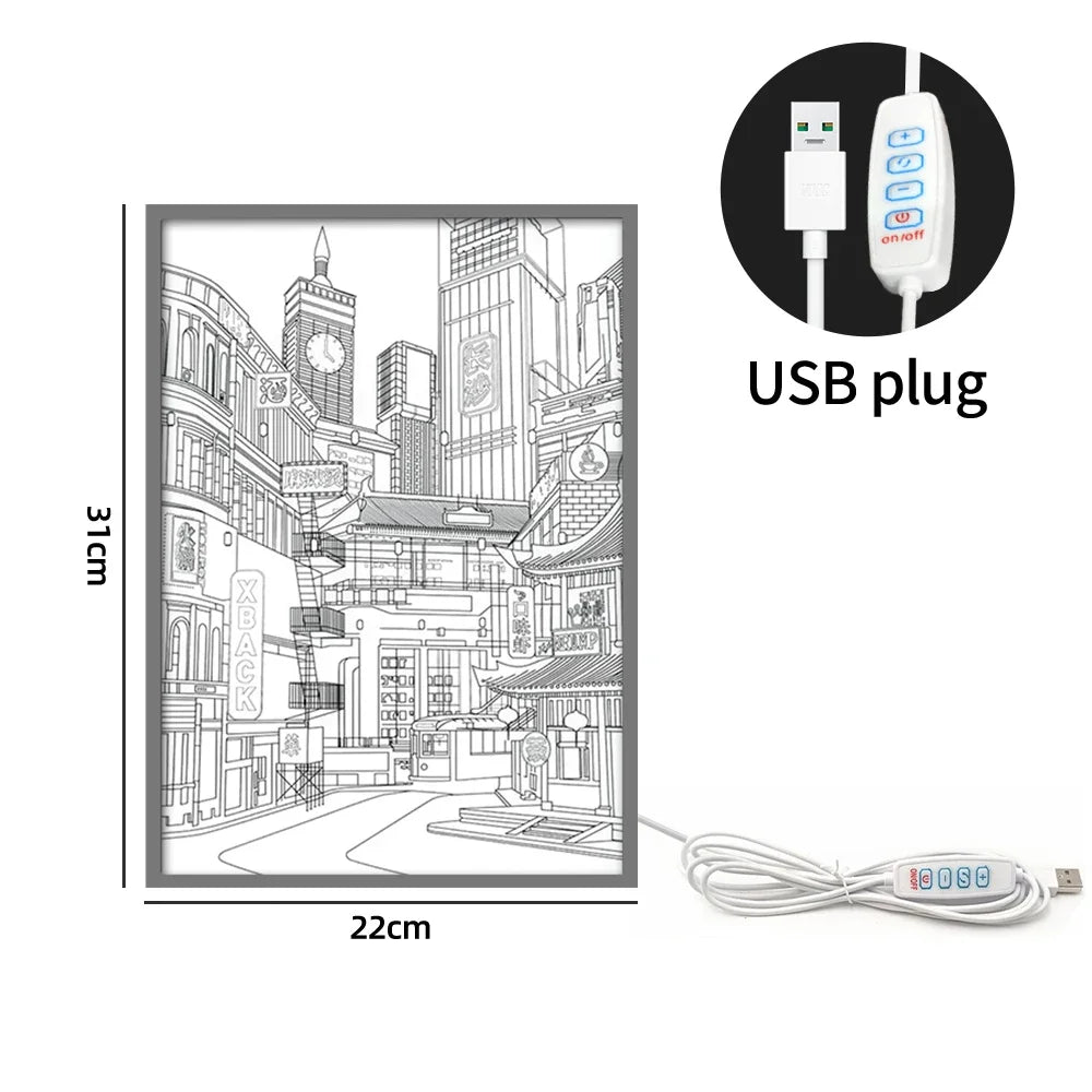 This layered LED night light features multi-depth artwork that creates a unique play of light and shadow. Designed with ABS and acrylic materials, it offers three illumination modes: cool, natural, and warm light. The piece functions as both décor and ambient lighting, producing a soft glow ideal for bedrooms, living rooms, and holiday settings. Powered by a 5V DC source with low energy usage of 0–5W.